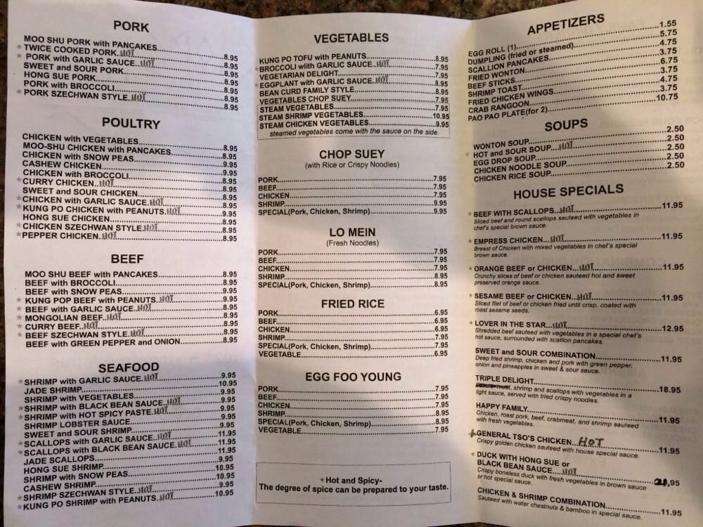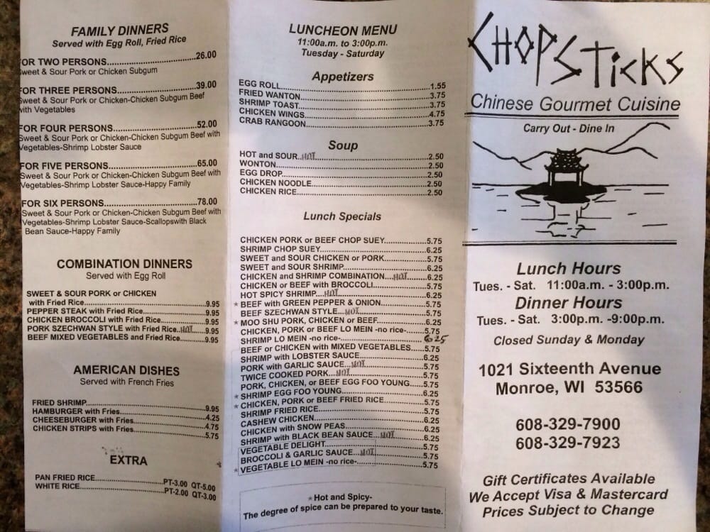 Introducing the menu at New Chopsticks, a Chinese restaurant located in Monroe, WI. This unclaimed gem offers a variety of lunch specials, including Chicken or Pork or Beef Chop Suey, Sweet & Sour options, and dishes with broccoli or mixed vegetables. Customers have raved about the quality and freshness of the food, with standout items like Crab Rangoons, Steamed dumplings, and Shrimp Egg Foo Young receiving high praise. While some reviewers mention slight delays in service, the overall dining experience is positive, with ample portions, friendly staff, and delicious offerings like hot & spicy shrimp and egg drop soup. Don't miss out on the opportunity to try the revamped New Chopsticks for a satisfying Chinese meal with your family or friends. Make sure to indulge in their delightful chicken wings and wanton soup for a truly fulfilling dining experience.